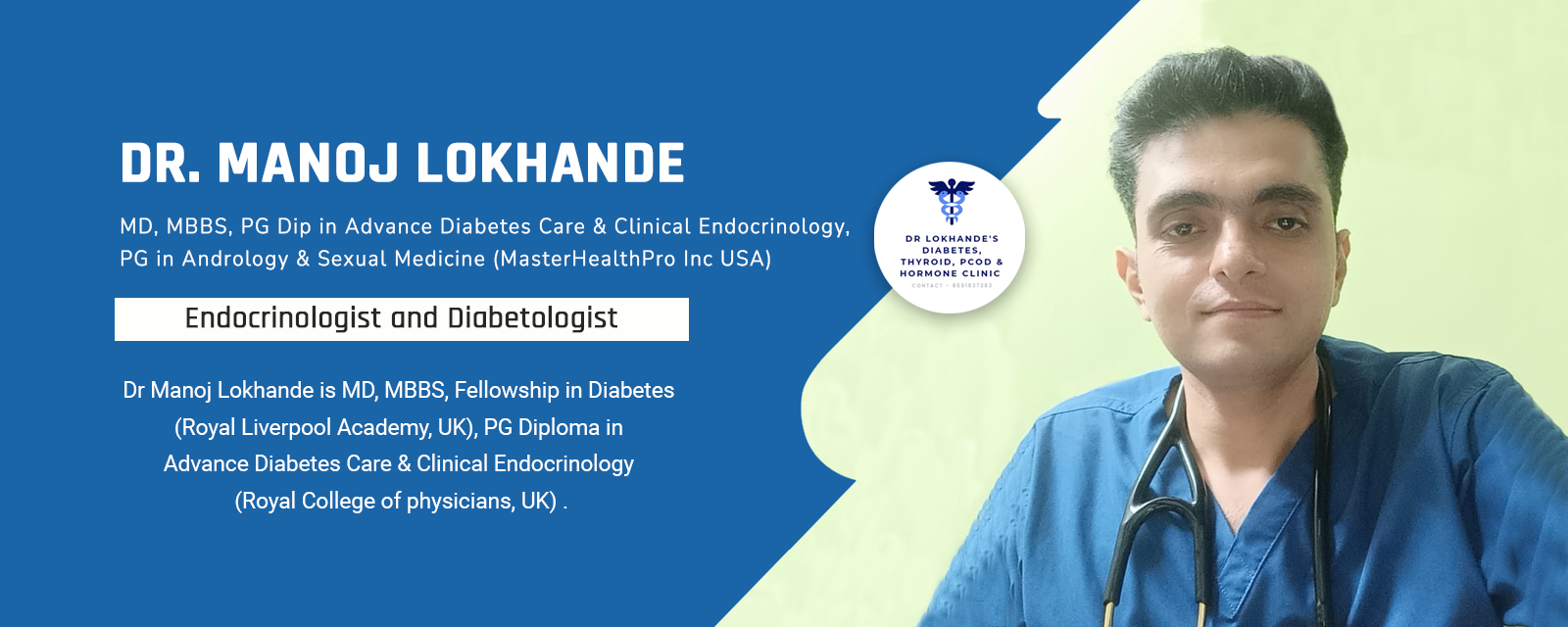 Dr Manoj Lokhande is MD, MBBS, Fellowship in Diabetes (Royal Liverpool Academy, UK), PG Diploma in Advance Diabetes Care & Clinical Endocrinology (Royal College of physicians, UK) and PG in Andrology and Sexual Medicine (MasterHealthPro Inc USA). Doctor has certification of Diabetes from International Diabetes Federation. Doctor is also Scope certified international Obesity Expert (World Obesity Federation). Doctor has special certification for Thyroid (CCMTD - Accredited by Asian Endocrine Society). Doctor also has Certification of Management of Heart diseases from Royal College of physicians & ACMDC (World Heart Federation).